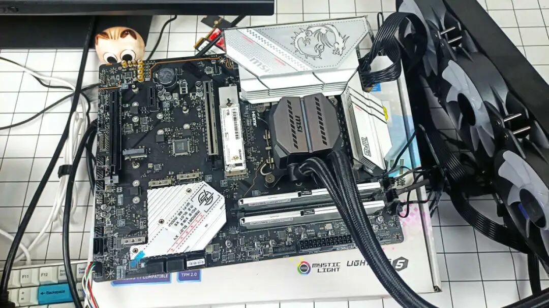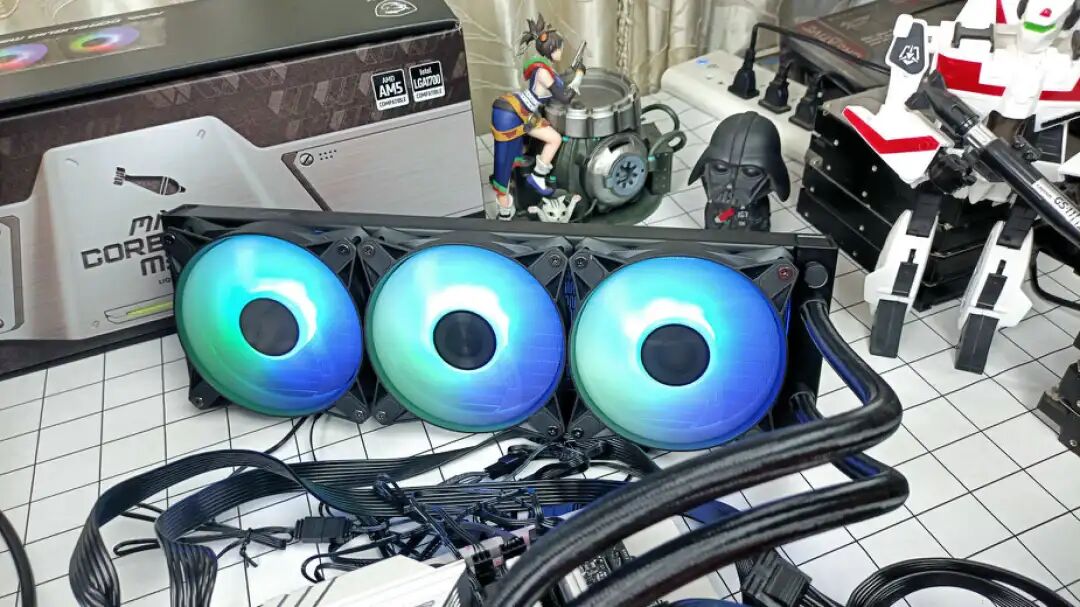 我这里用的是微星M360 迫击炮一体式水冷散热器,属于中低端产品,价格不贵。不过散热效果很好,而且还可以使用微星的msi center软件,来控制水冷的风扇转速。产品自带三把RGB风扇,它们的转速在500-2200 RPM±10%之间,最大静风压3.68mmH2O,风扇承诺5万小时无故障运行寿命,标称噪音低于32.9 dBA。此外,通过msi center软件还可以控制水冷泵上的RGB灯效,以及三把风扇的RGB光效。