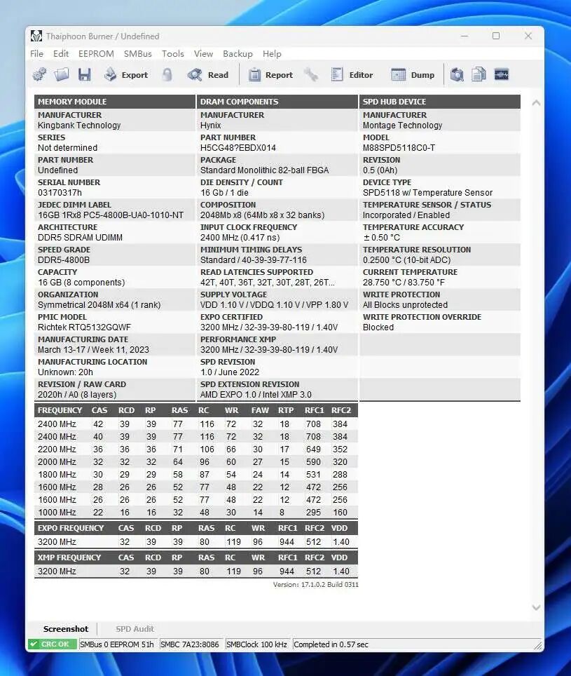 ThaiphoonBurner软件界面,可以看到颗粒的确是海力士的A-die CL32颗粒。