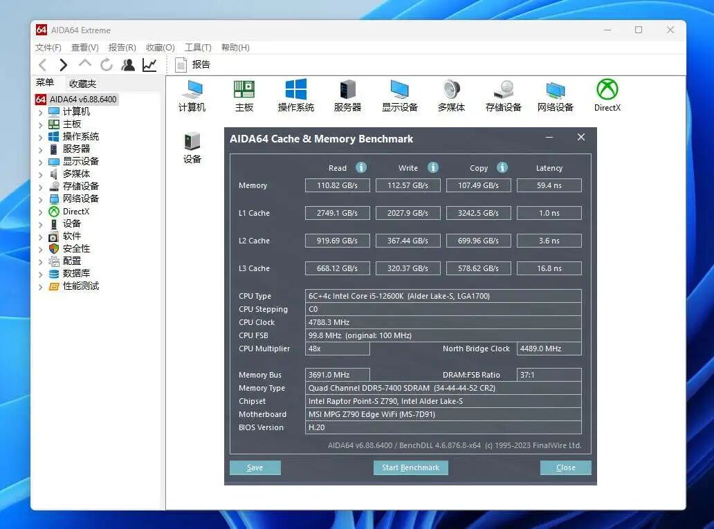 超频后,在AIDA64软件的测试,读写速度都已经超过了11万MB/s,时序也降到了59.4ns,要比XMP模式下的得分成绩好看多了。可见海力士的A-die CL32颗粒的确很能超。如果国产的DDR5长鑫颗粒,能有这样的表现就好了。