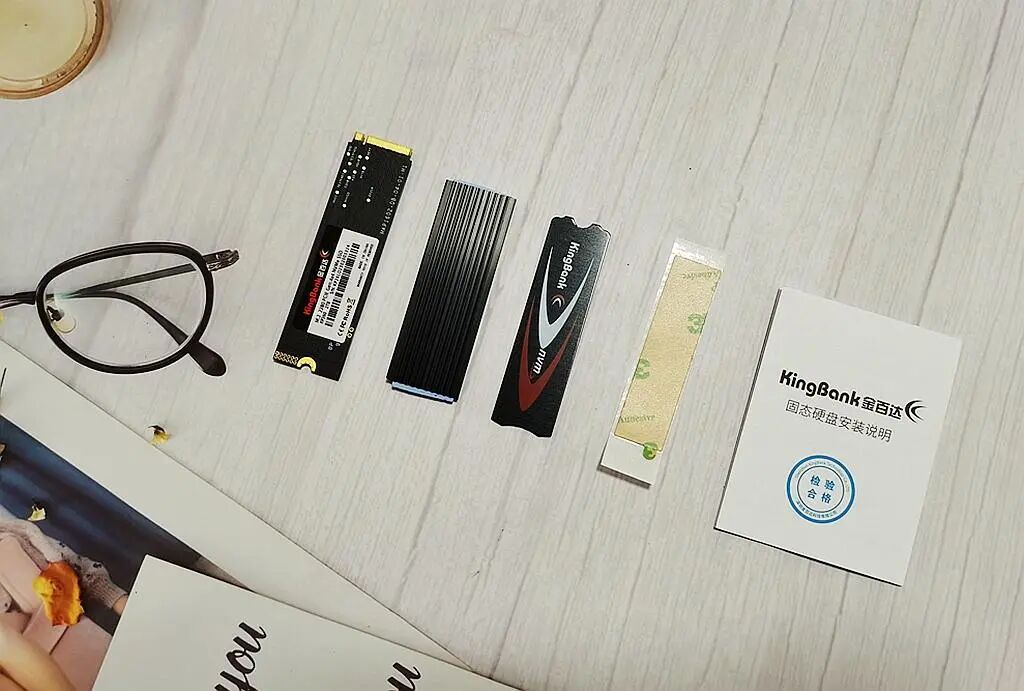 拆开之后:一块金百达KP260 SSD,一包十字螺丝,一片硅胶散热贴,一片金属散热马甲和安装说明书;散热贴并没有直接贴在SSD上的,需要用户动手将SSD的主控和颗粒位置进行包裹。
