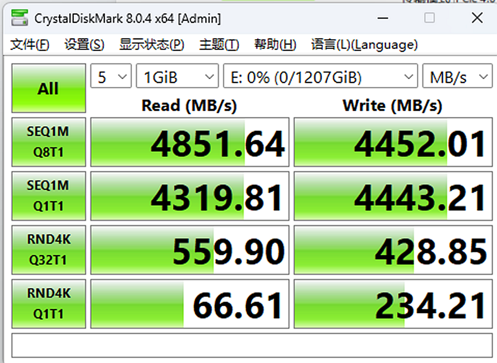 实际选用几款软件对其进行读写速度测试,通过CrystalDiskMark测试金百达KP260固态硬盘读取速度为4851.64MB/s、写入速度为4452.01MB/s 。这与官方宣称的读取和写入速度基本一致,说明金百达KP260固态硬盘性能非常强劲且传输速率稳定。