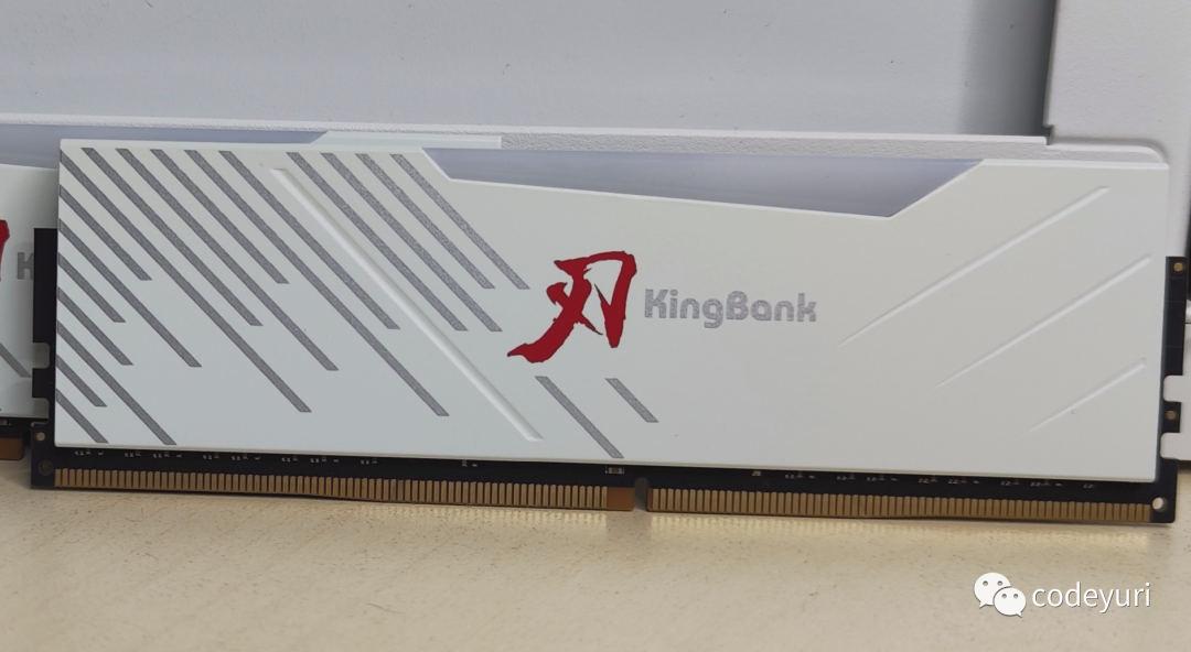 内存采用了白色的金属马甲,马甲的用料比幻光系列要好很多。马甲左侧有斜着的黑色纹理,中间有刃系列和金百达的logo。