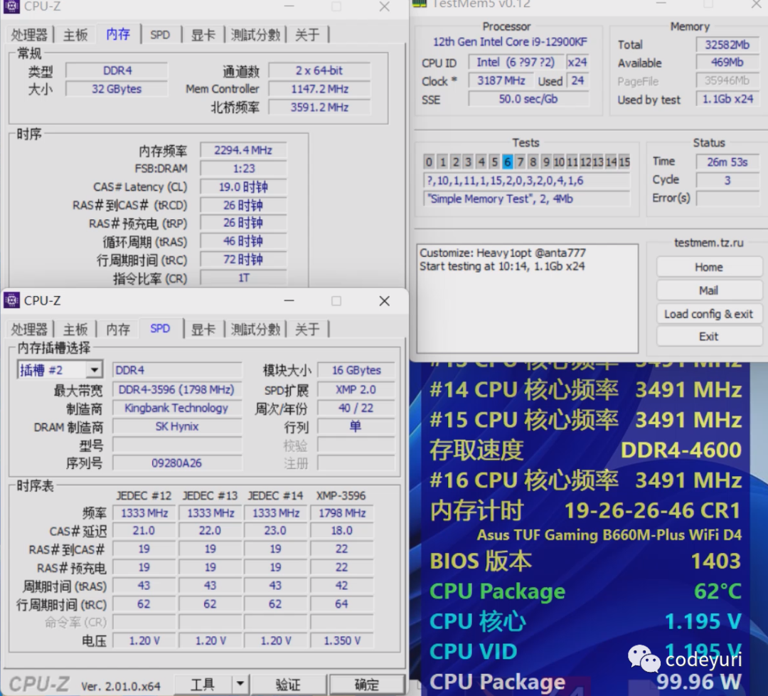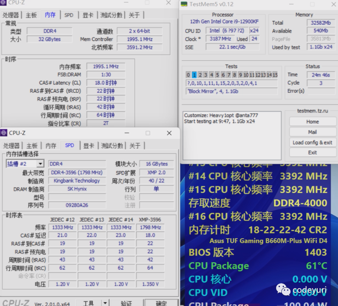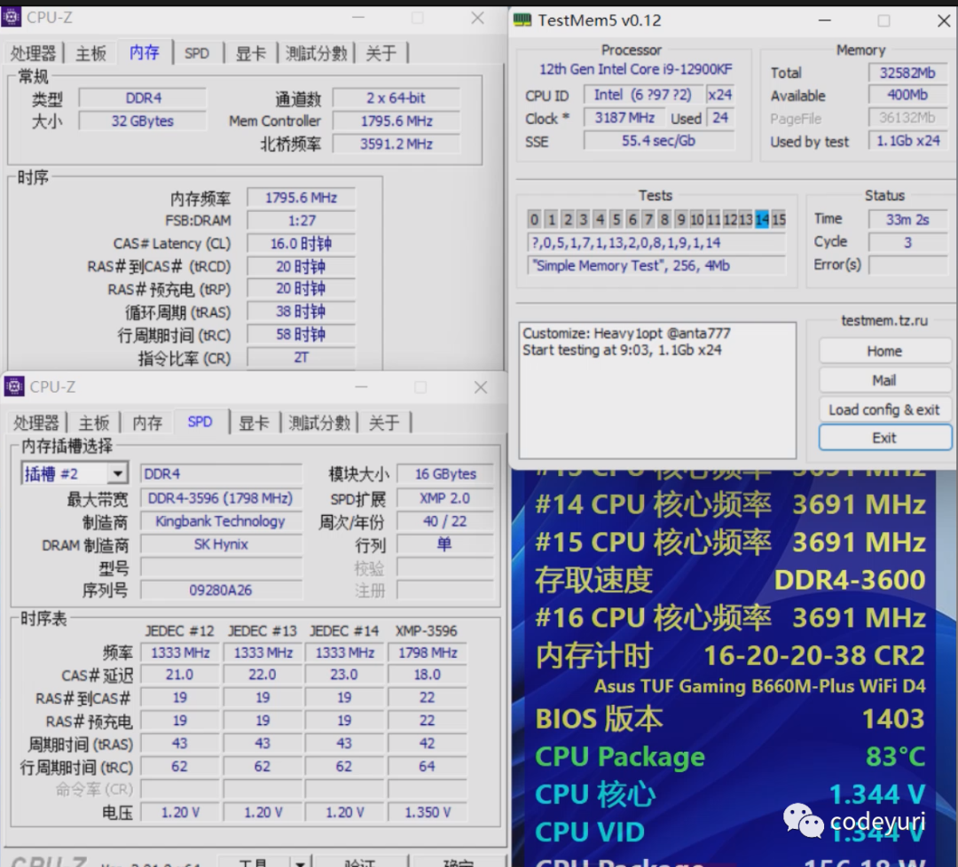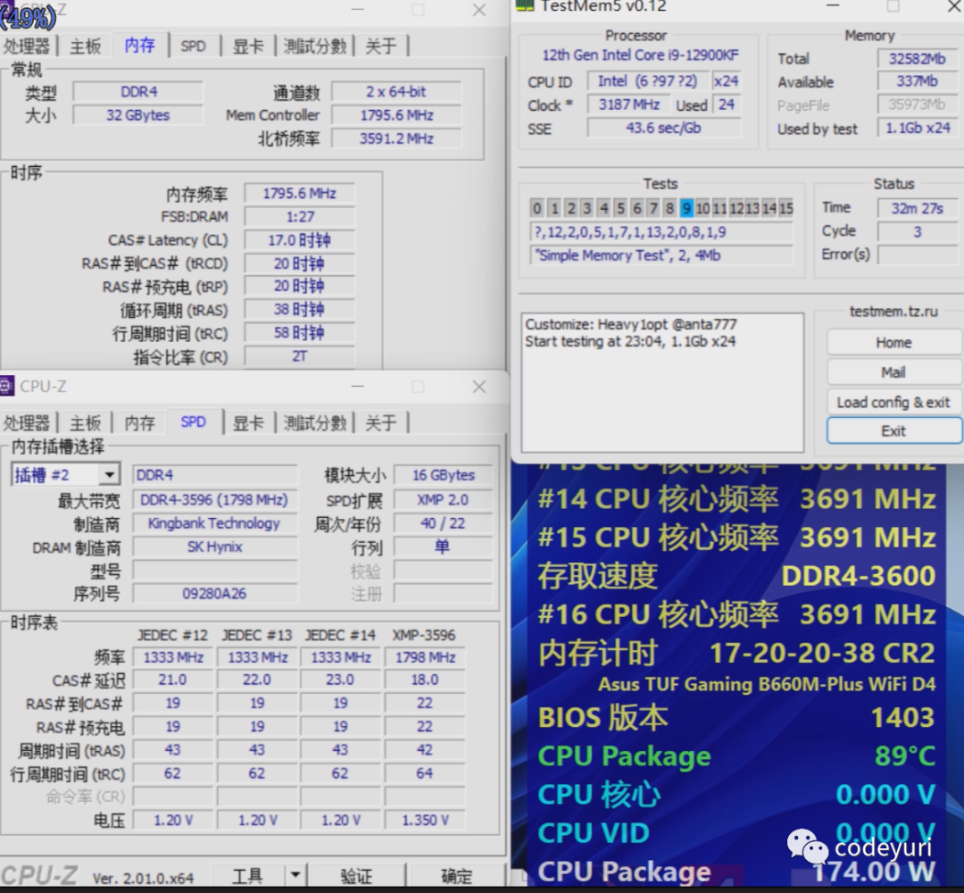 测试平台CPU是I9-12900KF 主板是华硕TUF B660M重炮手WIFI D4 在3600频率1.35V电压可以把时序降低到17-20-20