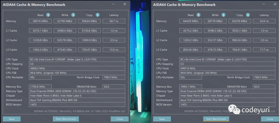 超频上时序这块和同颗粒的金百达幻光RGB差不多,高频上要稍微强些。 效能上仅开启3600 XMP,读取带宽5.8W,写入5.28W,拷贝5.56W,延迟58.7,4000频率压部分小参是,读取带宽6.44W,写入5.88W,拷贝6.33W,延迟55.6,性能上有大幅的提升。